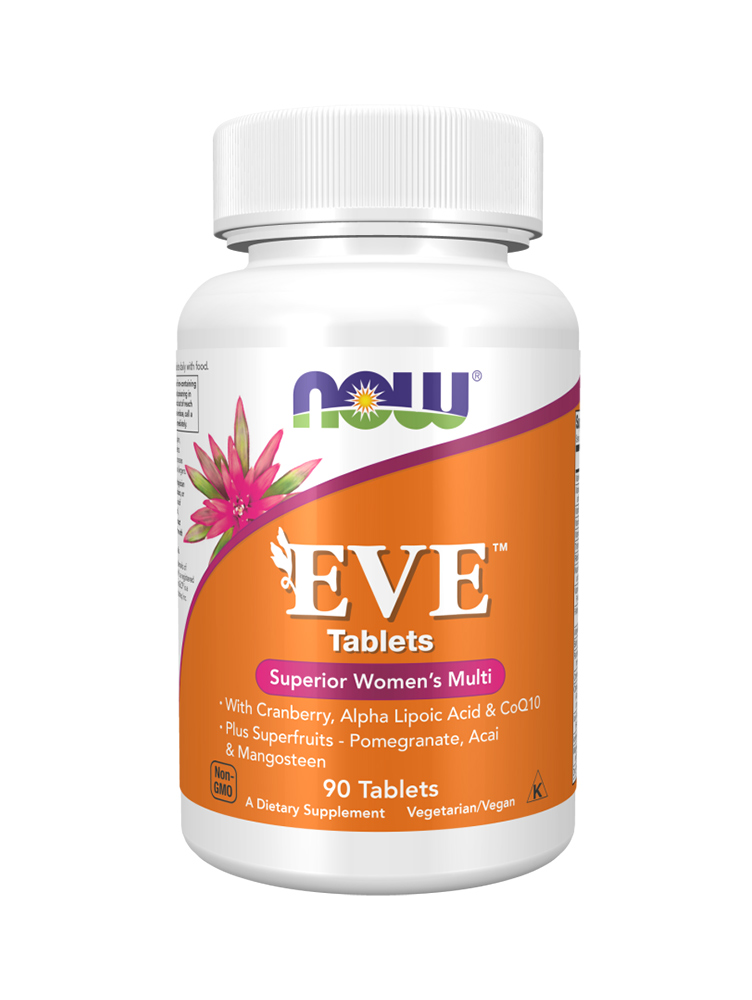 NOW Eve™ Women’s Multiple Vitamin tablete su posebno formulisane za potrebe vitamina odraslih žena, sa dodatkom brusnice, alfa-lipoinske kiseline, koenzima Q10 (CoQ10), super voća i još mnogo toga. Ova jedinstvena formula sadrži 100% preporučene dnevne vrednosti gvožđa, koristeći Ferrochel™, oblik gvožđa koji ne izaziva zatvor.