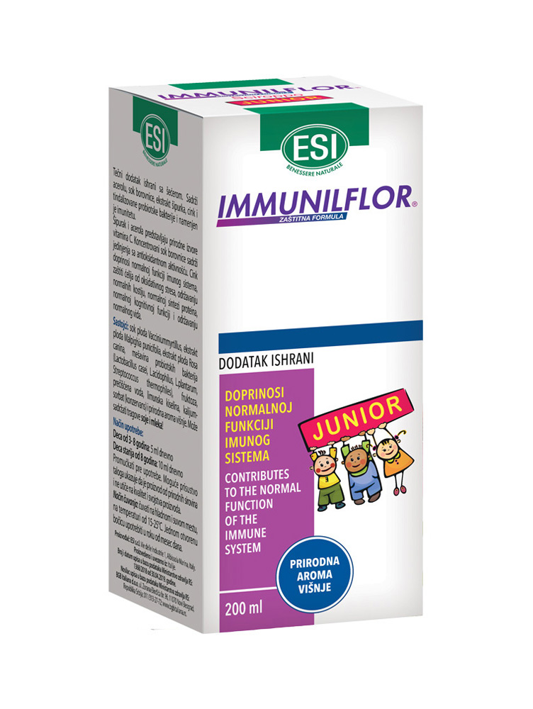 Immunilflor Junior sirup za decu sa borovnicom, cinkom, ekstraktom šipka, acerolom i tandalizovanim probiotskim bakterijama namenjen je jačanju imuniteta.