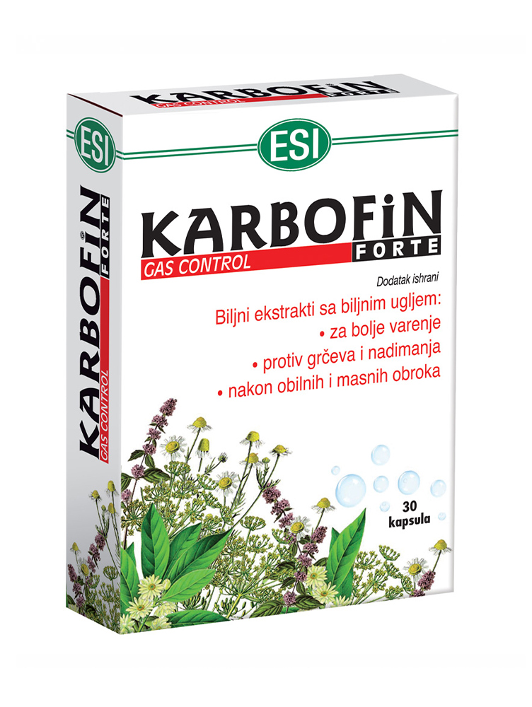 Karbofin Forte kapsule sadrže biljni ugalj sa biljnim ekstraktima i etarskim uljima morača, mente, kamilice i anisa. Koriste se protiv grčeva i nadimanja, nakon obilnih i masnih obroka i za bolje varenje.