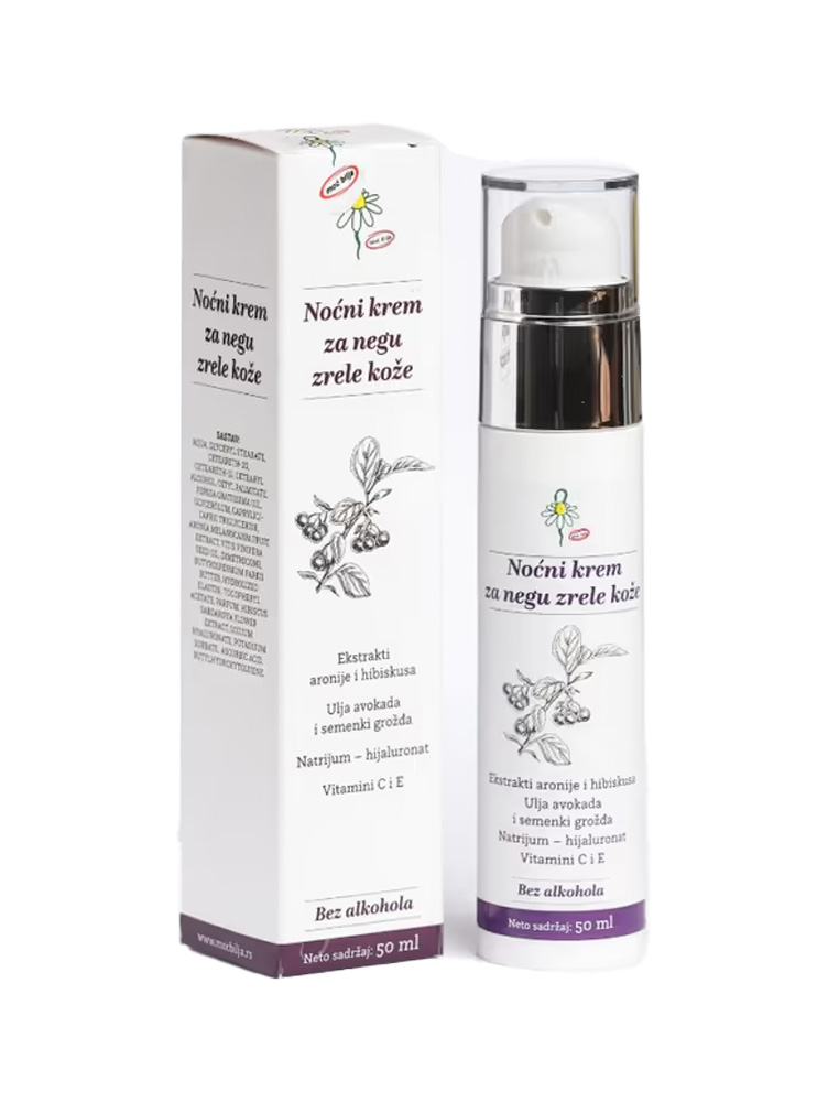 Noćni anti-age krem je namenjen da pruži sveobuhvatnu negu za sve tipove kože. Obogaćen je ekstraktima aronije i hibiskusa, uljem avokada i semenki grožđa, kao i shea puterom, koji efikasno hrane i revitalizuju kožu. Hijaluronska kiselina, kao prirodni vlažeći faktor, zadržava vlagu, pružajući koži zategnutost i svežinu. Elastin i vitamin C podstiču proizvodnju kolagena, dok joj kolagen i elastin daju elastičnost i čvrstinu. Antioksidativno delovanje vitamina E sprečava prerano starenje i pojavu bora, čineći kožu mladalački blistavom.