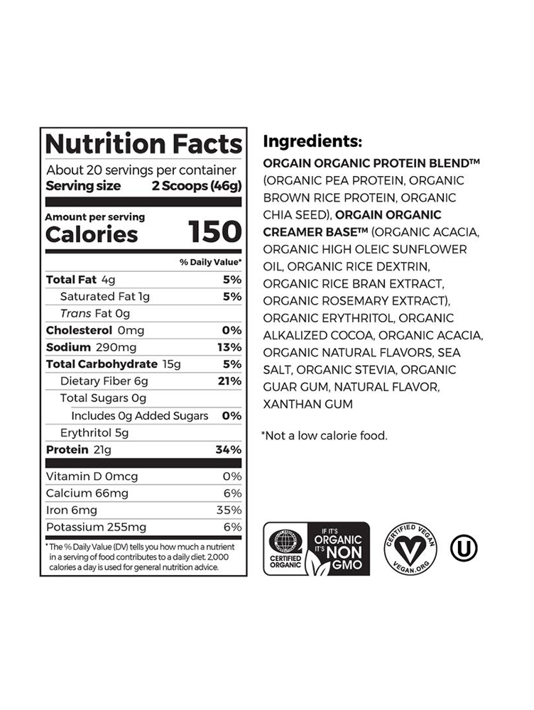 Orgain Organic Protein Blend™  (protein graška, protein smeđeg pirinča, čia seme), Orgain Organic Creamer Base™ (bagrem, visoko oleinsko suncokretovo ulje, pirinčani dekstrin, suncokretov lecitin, ekstrakt ruzmarina), organski eritritol, organski alkalizovan kakao, organski bagrem, organske prirodne arome, morska so, organski ekstrakt stevie, organska guar guma, prirodna aroma, ksantan guma.