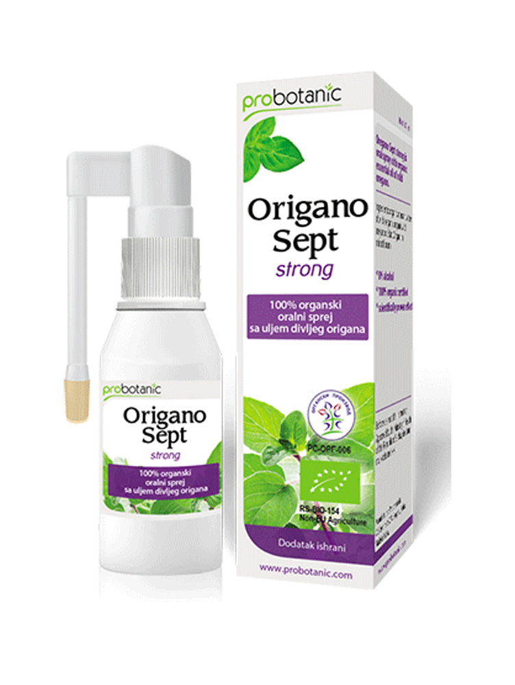 Origano Sept Strong je 100% organski oralni sprej sa esencijalnim uljem divljeg origana koji efikasno deluje protiv bakterija i gljivica u usnoj duplji. Pomaže kod nadraženog, suvog i bolnog grla, štiti sluznicu grla, usne duplje i ždrela, ublažava simptome upale desni i osvežava dah.