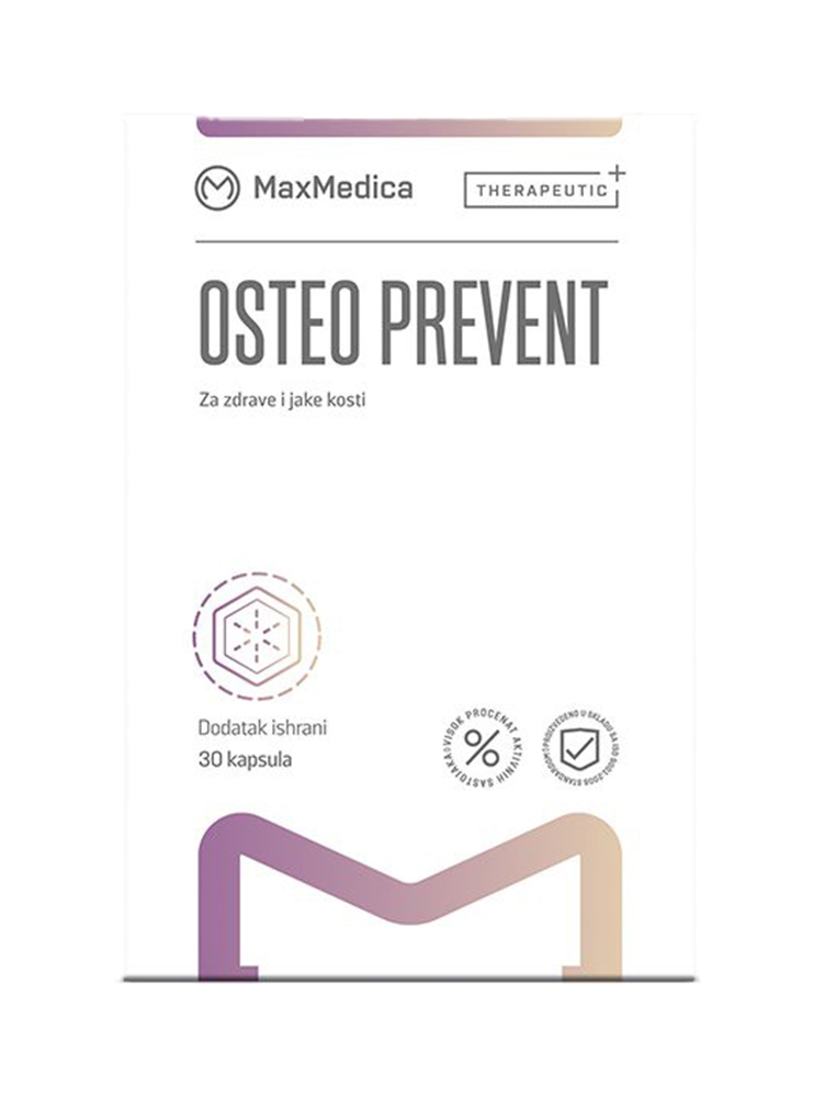 Osteo Prevent Forte sadrži kalcijum citrat, vitamin D3 i vitamin K2, koji deluju sinergistički i podržavaju očuvanje strukture kostiju i doprinose prevencije osteoporoze. Preporučuje se primena kod osteoporoze, osteopenije, kod žena tokom menopauze i postmenopauze, kod preloma kostiju, kao i tokom dugotrajne terapije sistemskim kortikosteroidima.