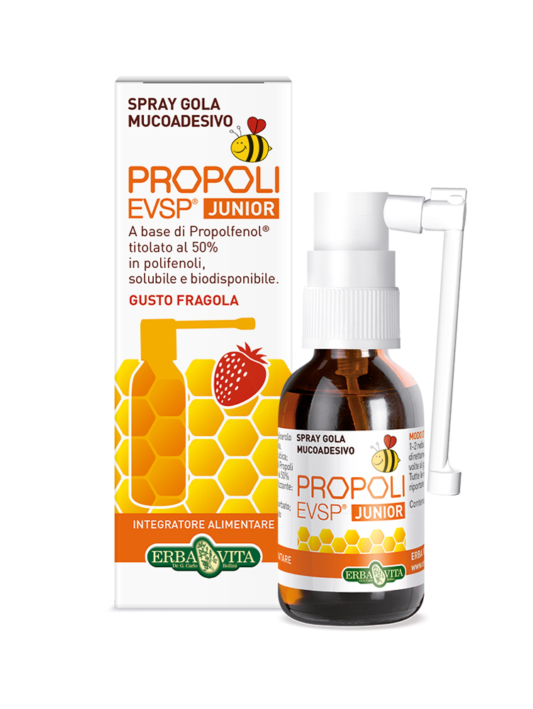 Propoli EVSP Junior sprej za grlo formulisan je tako da duže prijanja na sluzokožu usne duplje. Preparat je zasnovan na Propolfenol® plus fitokompleksu propolisa, zelenog čaja i semena grožđa sa visokim sadržajem polifenola (50%). Aroma jagode čini ga prijatnim za decu.