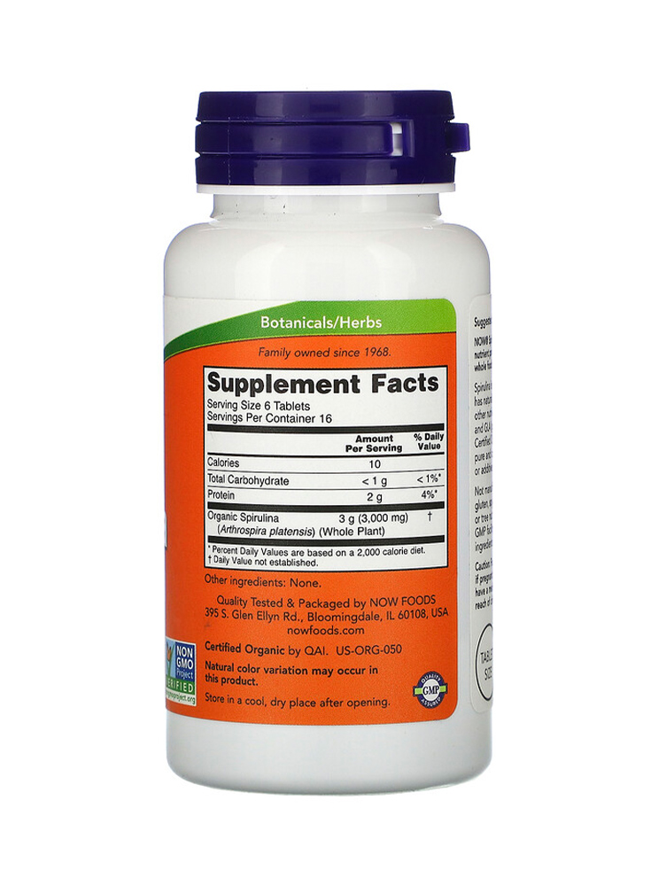 Spirulina je plavo-zelena mikroalga koja sadrži proteine (70%), aminokiseline, beta karoten, hlorofil, vlakna, GLA (gama-linolenska kiselina) i širok spektar vitamina i minerala. NOW® Spirulina isporučuje prirodni profil hranljivih sastojaka koji se nalazi u pravoj integralnoj hrani.